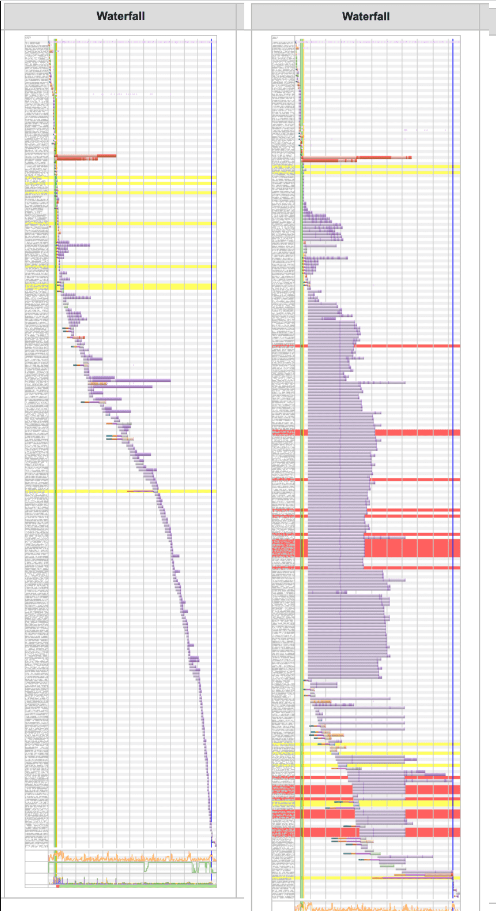 왼쪽이 HTTP/1.1, 오른쪽이 HTTP/2이다. HTTP/2 쪽의 붉은 라인은 이미지 요청 에러인데, 스테이징 환경에서 리소스 출처 문제로 인해 발생하는 403에러이기 때문에 무시해도된다.