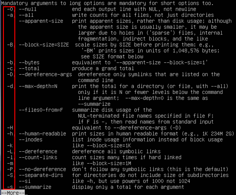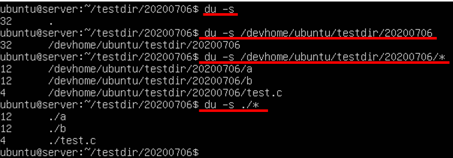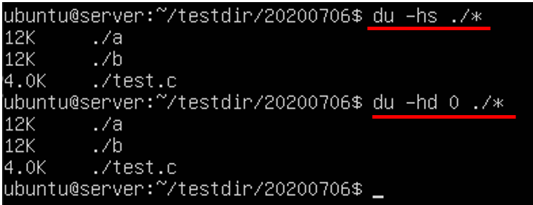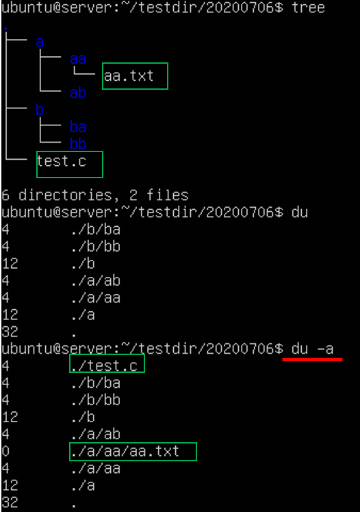 du만 했을 때는 초록색으로 표시된 파일 사용량이 출력되지 않았지만, -a옵션을 주니까 현재 디렉터리내 파일뿐만 아니라 하위 디렉터리 파일 용량까지 출력해주는 것을 볼 수 있어요.