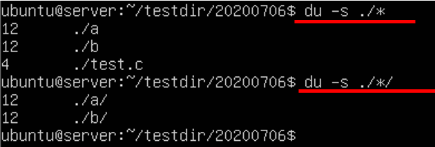 근데 뒤에 '모든'을 나타내는 *를 사용해서 경로를 표시하면, 그 경로에 있는 모든 파일 및 디렉터리에 대해 사용량을 표시해줍니다.
