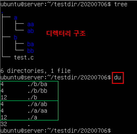 실제 간단하게 디렉터리를 만들어서 테스트 해보면, 가장 포괄적인 a와 b디렉터리만 보여주는게 아니라 그 하위 디렉터리 사용량까지 표시해주고 있죠. 운영체제에 따라 다르지만 리눅스에서는 기본적으로 1024바이트(=1KB)가 기본 단위입니다.