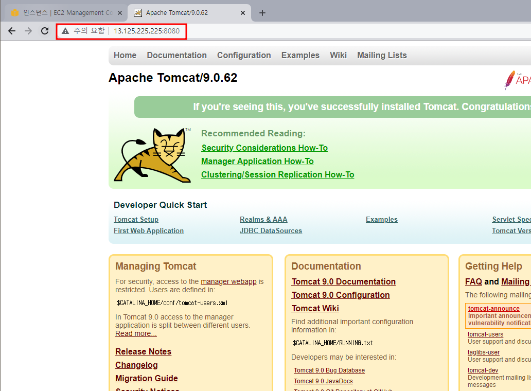 위의 페이지가 나온다면 정상적으로 인스턴스가 실행된 것이고, 가상 컴퓨팅 환경에 세팅이 잘 된 것이다.