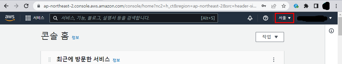 AWS 사이트에서 로그인을 하면 우측 상단에 위치가 뜰 것이다. 위치를 한국(서울)으로 변경한다.
