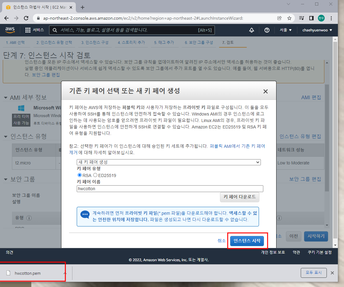 새 키 페어 생성을 해주고, RSA를 체크한 후에 키 페이 이름을 적어주고 키 페어를 다운로드한다.