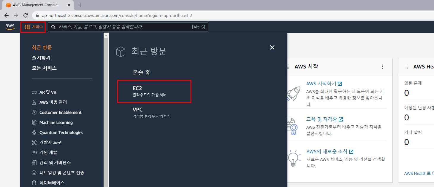 3. 모든 서비스에서 EC2를 찾아서 클릭