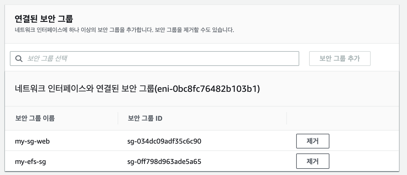 파일시스템이 생성되었다면 EC2로 파일시스템에 인스턴스 네트워크 액세스 권한을 연동이 사전에 생성한 EC2의 보안그룹을 변경합니다.