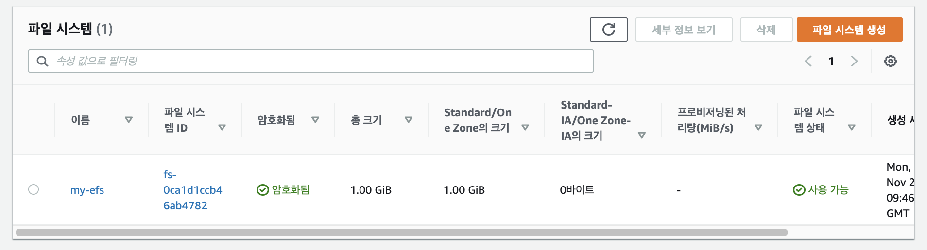 $ sudo mount -t nfs4 -o nfsvers=4.1,rsize=1048576,wsize=1048576,hard,timeo=600,retrans=2,noresvport fs-0ca1d1ccb46ab4782.efs.ap-northeast-2.amazonaws.com:/ efs