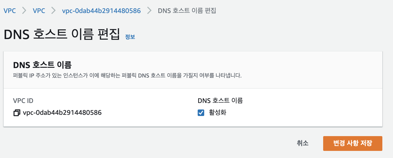 VPC의 경우 DNS이름 활성화가 체크되어 있어야 합니다.