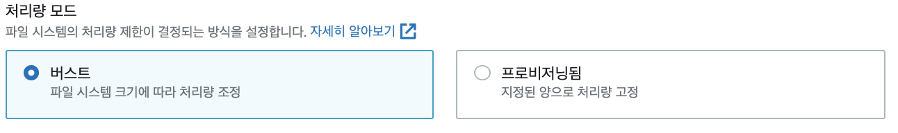 처리량 모드 파일 시스템에 대해 버스팅 처리량과 프로비저닝 처리량의 두 가지 처리 모드 중에서 선택할 수 있습니다. 버스팅 처리량 모드에서는 표준 스토리지 클래스의 파일 시스템 크기가 커짐에 따라 Amazon EFS의 처리량이 조정됩니다. 프로비저닝 처리량 모드를 사용하면, 저장된 데이터의 양과 상관없이 파일 시스템의 처리량(MiB/s)을 즉시 프로비저닝 할 수 있습니다.