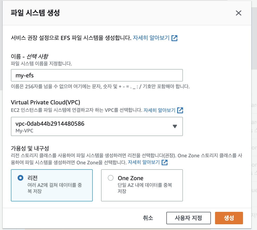 파일 시스템 생성 창에서 이름은 'my-efs', VPC는 'my-vpc', 가용성은 '리전'으로 선택합니다.