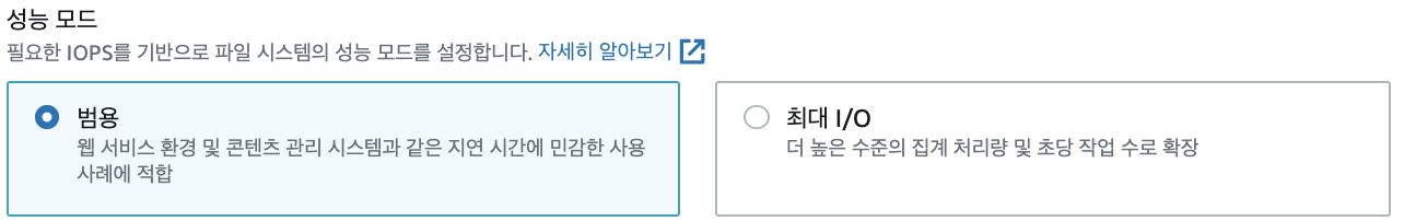 성능 모드 광범위한 클라우드 스토리지 워크로드를 지원하기 위해 Amazon EFS는 두 가지 성능 모드를 제공합니다. 파일 시스템의 성능 모드는 파일 시스템을 만들 때만 선택할 수 있습니다. 이들 두 가지 성능 모드에는 추가 비용이 청구되지 않으므로 Amazon EFS 파일 시스템은 성능 모드와 관계없이 동일하게 청구 및 측정됩니다.