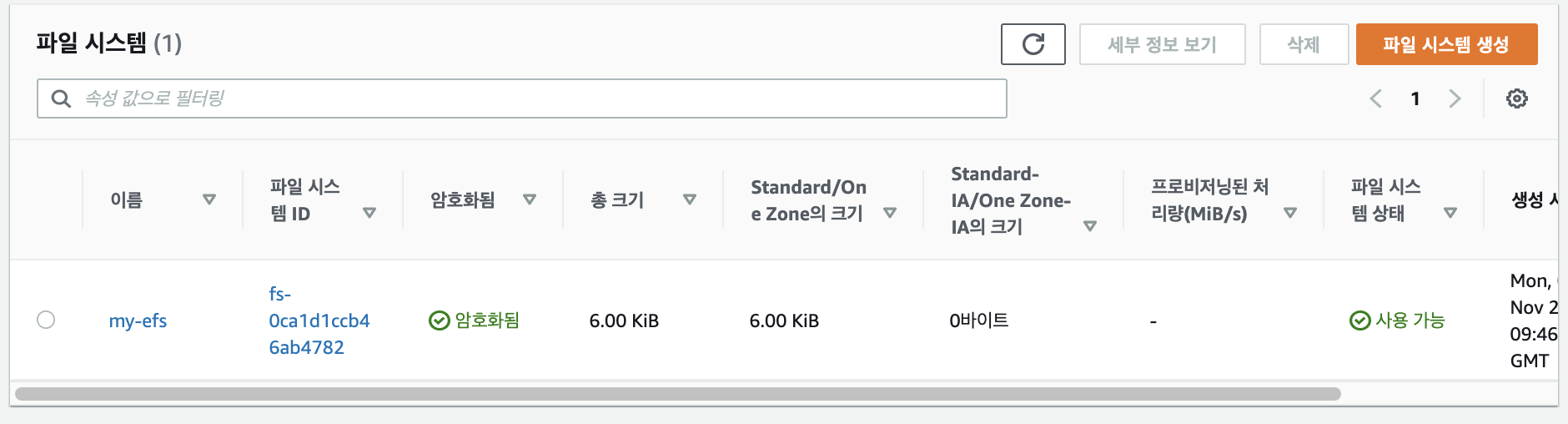 EFS 메뉴로 이동합니다. 파일 시스템 생성 버튼을 클릭하여 생성 과정을 진행합니다.