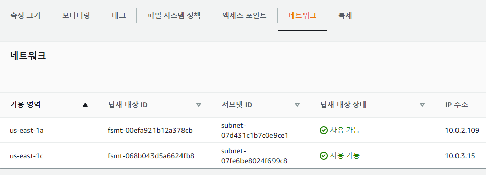 위의 과정을 완료하면 EFS의 네트워크 탭에서 Mount Target을 확인할 수 있습니다.