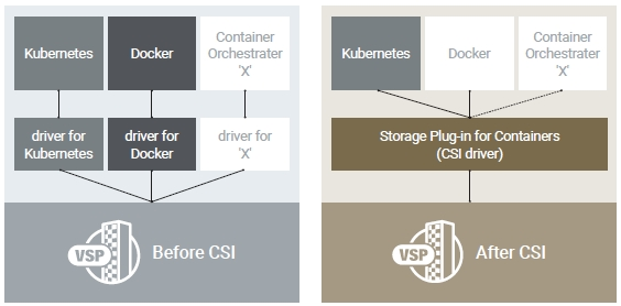 위의 그림과 같이 csi 도입 이전에는 각 플랫폼별로 별도의 드라이버를 필요로 했지만, csi를 통해 하나의 드라이버로 모든 플랫폼에서 편리하게 스토리지를 제어할 수 있게 되었습니다.