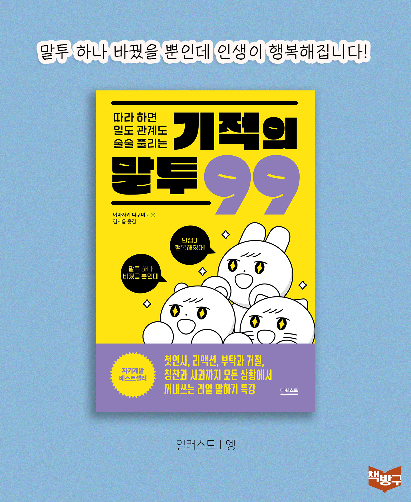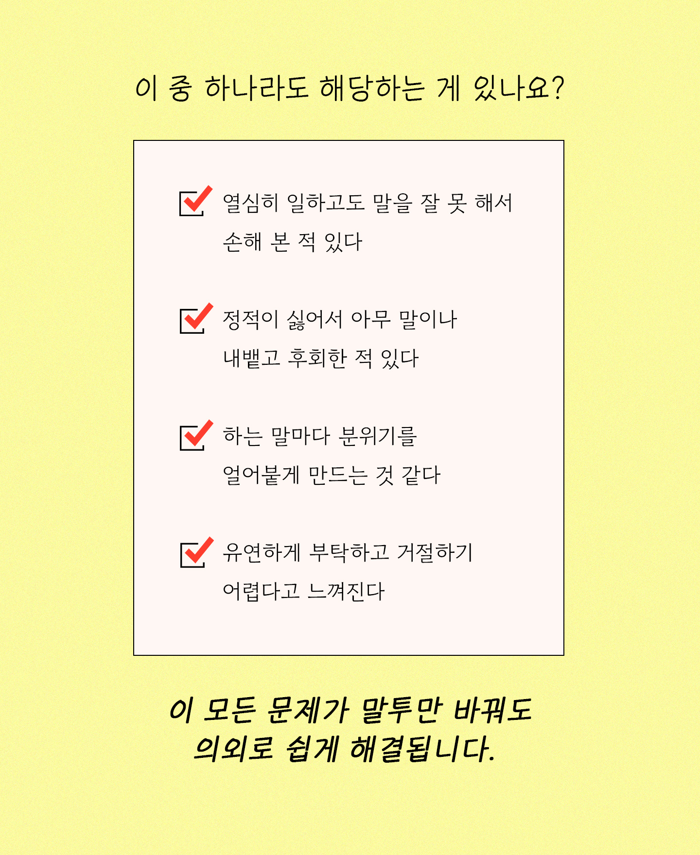 일도 관계도 술술 풀리게 하는 사소한 한 끗, 센스 있는 말투를 다룬 책이다. 저자는 만나는 모든 사람으로부터 호감을 얻고 좋은 관계를 맺는 사람들의 공통점을 들여다봤다. 그리고 그들만의 남다른 말투와 센스를 분석해 책으로 출간했다. 일본에서 커뮤니케이션 천재로 유명한 저자는 이 책에서 첫인사, 리액션, 부탁과 거절, 칭찬과 사과까지 사회생활을 하면서 반드시 부딪히는 상황 99가지를 선별하고, 호감형 사람들의 센스 있는 말투와 평범한 사람의 말투를 비교해 설명한다. 평소 말 때문에 손해 본다는 생각이 들거나 좋은 관계를 맺는 데 도움 되는 화법이 궁금한 사람이라면 일상에서 바로 실천할 수 노하우를 이 책에서 만날 수 있을 것이다.