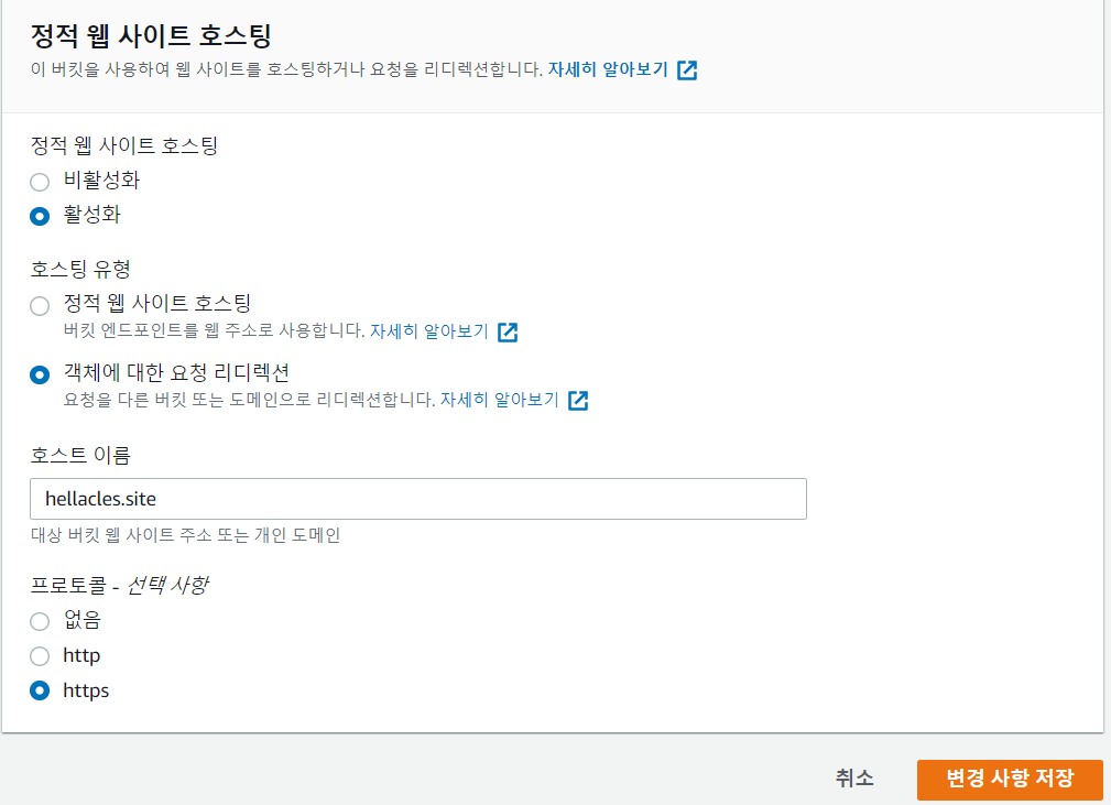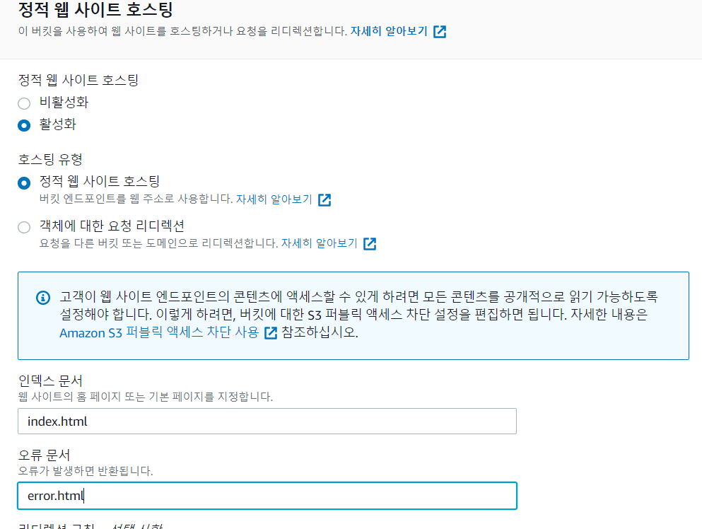 위의 버킷과 차이점은 정적 웹 사이트 호스팅에서 요청을 리디렉션 해주는 것 뿐이다.