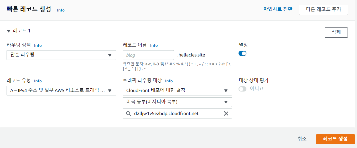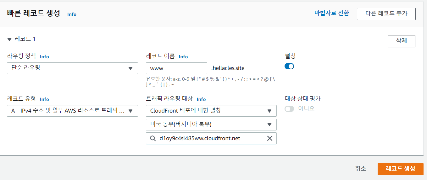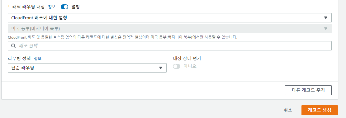 마지막으로 CloudFront 도메인을 Route53을 이용해 실제 서비스 도메인으로 매핑해주면 된다.