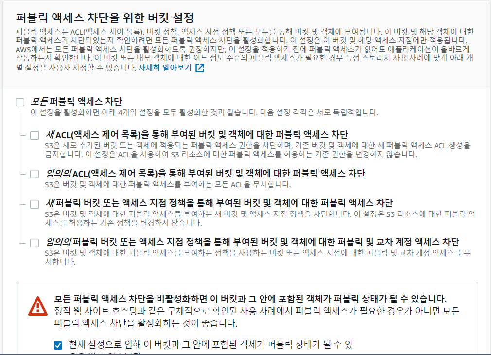 퍼블릭 액세스를 허용한 상태로 버킷을 생성한다.