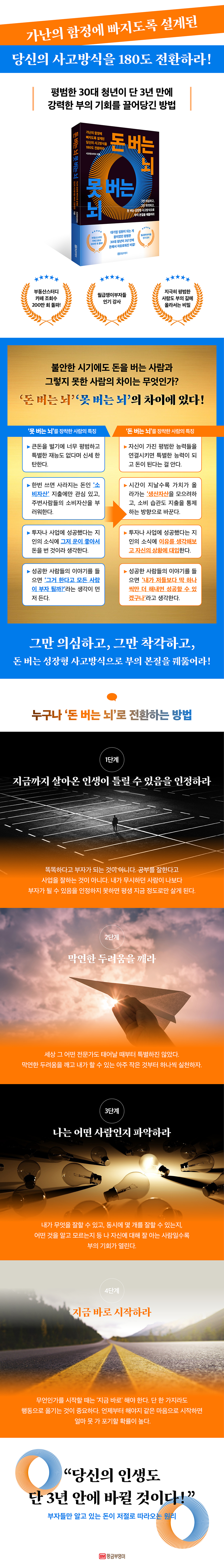 ‘못 버는 뇌’에서 ‘돈 버는 뇌’로 바꿀 수 있었던 시크릿브라더의 비결 불안한 시기에도 돈을 버는 사람들은 뭐가 다를까? 부자들은 일반인과 다른 뇌를 가지고 있다. 남들이 보지 못하는 것을 보고 남들보다 앞서간다. 사람들이 한곳으로 우르르 몰려갈 때 부자는 혼자 다른 곳을 바라보고, 남들이 다 안 된다고 말할 때 기필코 해내고 말겠다며 도전한다. 부자들은 이러한 차이를 명확하게 알고 있다. 『돈 버는 뇌, 못 버는 뇌』는 많은 사람들의 뇌에 깊숙이 박혀있는 빈자의 마인드를 부자의 마인드로 바꿔줄 책이다. 돈이 좋아하는 사람이 되고 싶다면 대중이 아닌 부자들의 행동방식을 따라야 부자가 될 수 있다. 저자 또한 본격적으로 투자를 시작하기 전까진 열심히는 살았지만 부자가 되기 어려운 ‘못 버는 뇌’를 가지고 있었다. 평범한 30대 청년이 부자들만 알고 있는, 돈이 저절로 따라오는 원리를 깨우치자 단 3년 만에 인생이 바뀌었다. 이 말은 지극히 평범한 사람도 3년 안에 ‘돈 버는 뇌’로 탈바꿈해 돈에 끌려다니는 사람이 아니라 돈이 좋아하는 사람이 될 수 있다는 뜻이다. 그만 의심하고, 그만 착각하고, 돈 버는 성장형 사고방식으로 부의 본질을 꿰뚫어라. 이 규칙을 알게 된다면 남들보다 두세 발짝 앞에서 미소 짓는 당신을 발견하게 될 것이다. 200만 명이 찾는 부동산 카페 ‘부동산스터디’에 깊은 통찰과 울림 있는 글 솜씨로 올리는 글마다 게시글 TOP 순위에 등극하는 인기 칼럼니스트 시크릿브라더와 함께 ‘돈 버는 뇌’를 만들어보자. |