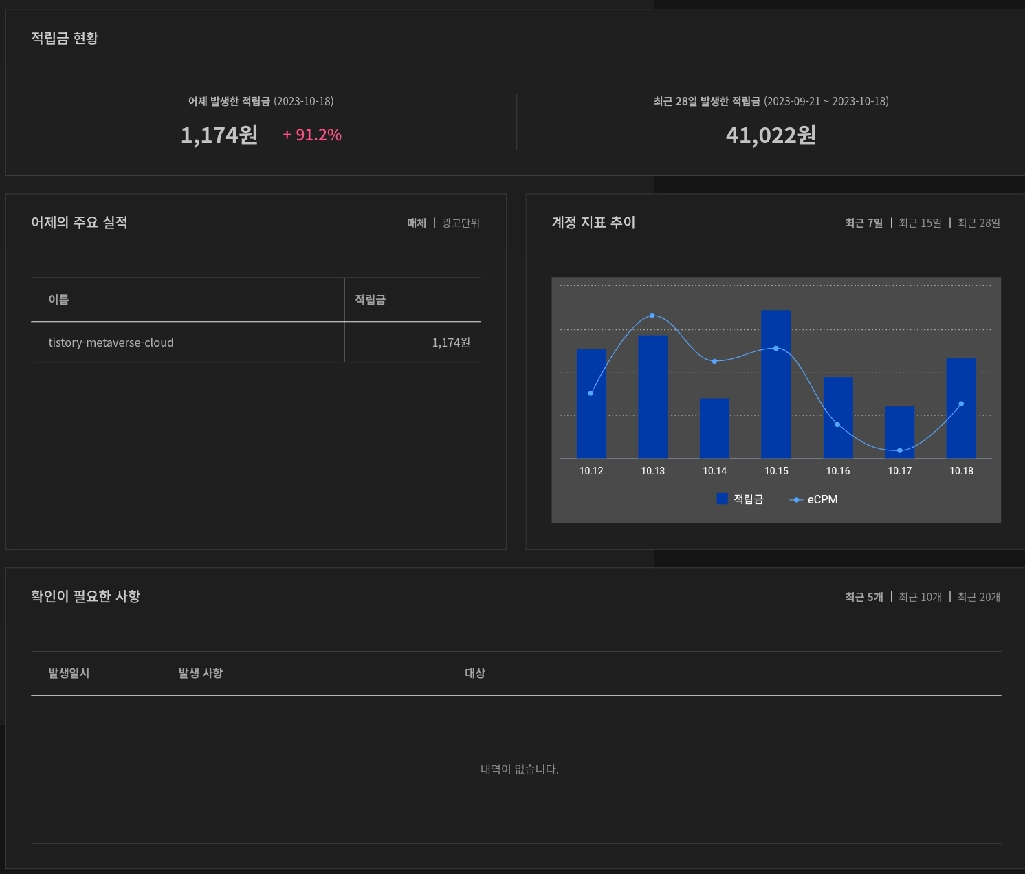 | [역행자 동기부여] 블로그 성장기 애드핏 수익 - 10/14 !! (44) | 2023.10.14 |