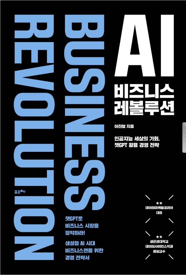 세상이 빠르게 변화하고 있다. 인공지능의 발전은 더 이상 인간과 AI의 분야를 비교할 수 없는 수준까지 이르렀다. 기존의 인공지능 챗봇과 달리 챗GPT는 대화의 범위와 답변의 수준이 한 차원이 아니라 사람 수준으로, 아니 전문가 이상으로 높아졌다. 챗GPT는 우리가 생각할 수 있는 거의 모든 질문에 매우 전문적이며 자연스러운 답변을 한다. 또 문서 요약, 보고서 작성 등 인간만 할 수 있는 영역으로 여겨진 분야까지 넘나들고 있다. 중요한 점은 챗GPT는 우리 일상의 패러다임을 바꿀 가능성이 보인다는 것이다. 이때, 우리는 무엇을 해야 하는가? 인공지능이 개인이나 기업의 업무를 일부 대체하는 영역까지도 가능하다는 점을 주목해야 한다. 이는 각종 산업과 서비스 등 다양한 영역에 영향을 미친다는 것이다. 이는 생성형 AI 자체가 경영의 판도를 흔들어 놓을 ‘게임 체인저’가 될 수도 있다는 의미다. 챗GPT는 이미 우리에게 새로운 비즈니스 모델을 제시했다. 생성형 AI 기반의 생태계가 시장을 긴장시키고 있다. 그렇다면 우리는 이제 완전히 새로운 관점으로 업무 습관을 형성하고 빠르게 변화의 흐름을 읽어야 한다. 《AI 비즈니스 레볼루션》에는 그 방향과 솔루션이 담겨 있다. 이 책으로 미래 비즈니스의 경영 전략을 수립할 수 있을 것이다. 그렇게 열린 문에 한 발 내디뎌, 새로운 기회를 쟁취해야 한다. 지금은 생성형 AI를 도입할 것인지 결정할 단계가 아니다. 어떻게 활용할지 고민해야 하는 시점이다.