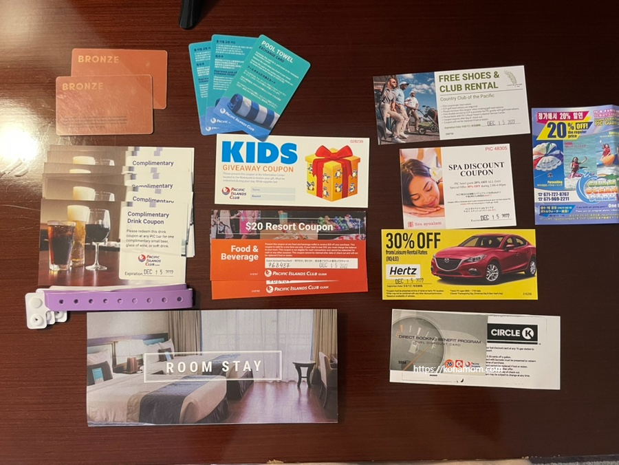 체크인하면 수영장 출입 팔찌와 타월카드, 룸키, 음료 쿠폰 등 여러 가지를 받는데, 예약에 따라 다를 수 있습니다.