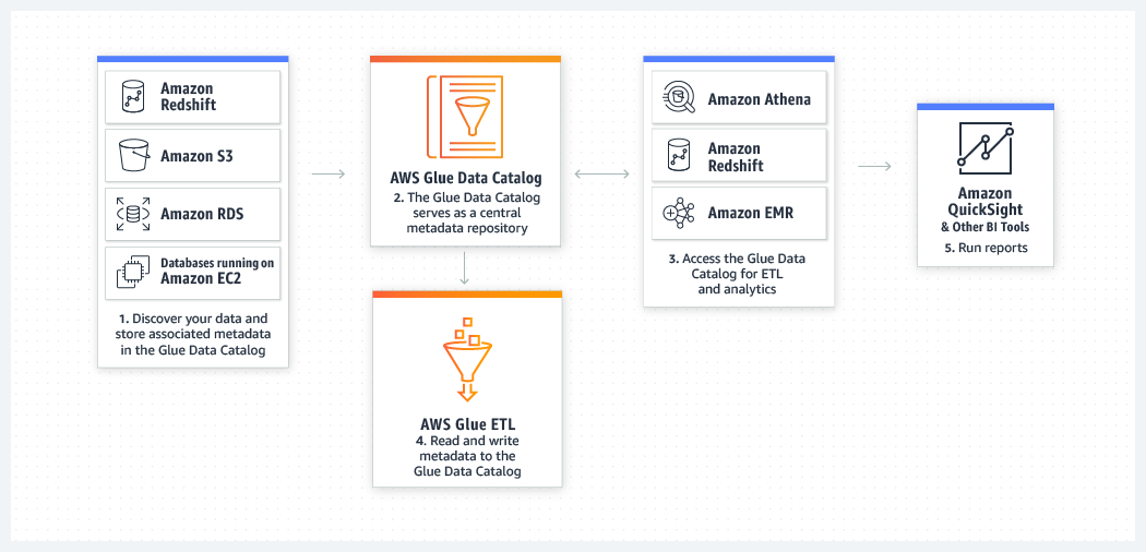 AWS Glue 데이터 카탈로그를 사용하면 데이터를 이동하지 않고도 여러 AWS 데이터 세트 전체에서 신속하게 데이터를 검색할 수 있습니다. 일단 데이터가 카탈로그에 저장되면 Amazon Athena, Amazon EMR 및 Amazon Redshift Spectrum에서 즉시 검색 및 쿼리에 데이터를 사용할 수 있습니다.