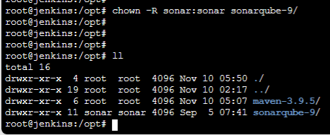 root@jenkins:/opt# chown -R sonar:sonar sonarqube-9/