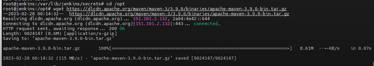 ubuntu@jenkins:/opt$ sudo wget https://dlcdn.apache.org/maven/maven-3/3.9.5/binaries/apache-maven-3.9.5-bin.tar.gz