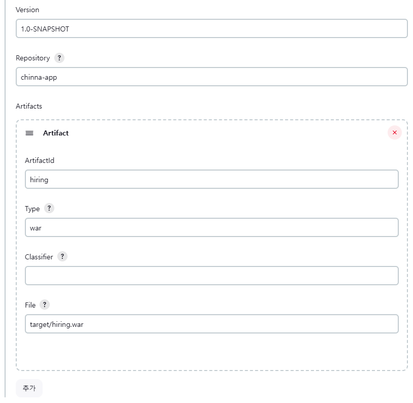 version: '0.1' (SNAPSHOT 들어가면 안됨, 숫자만 입력)