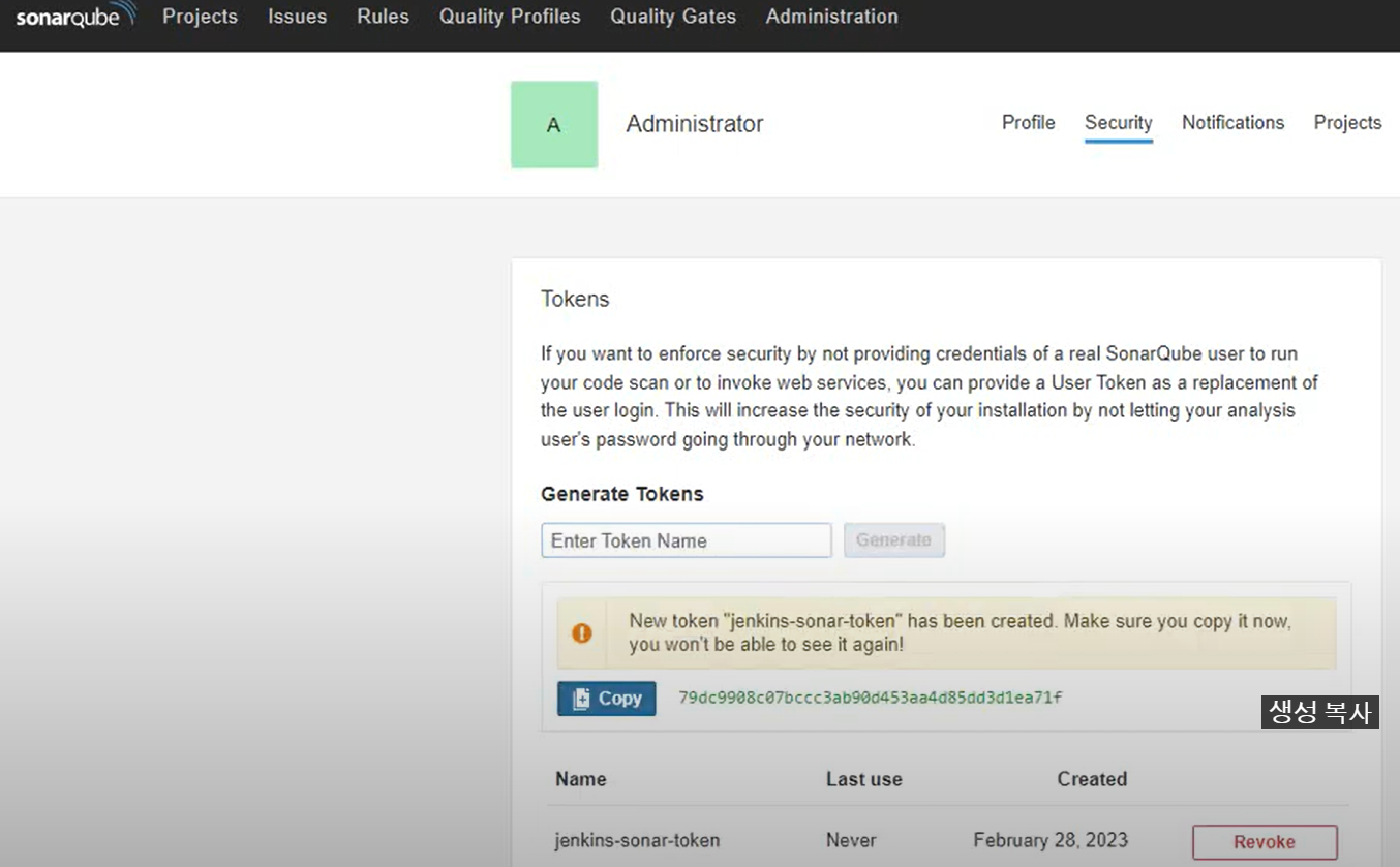 ## 소나큐브로 이동 (토큰 생성 후 복사 저장)