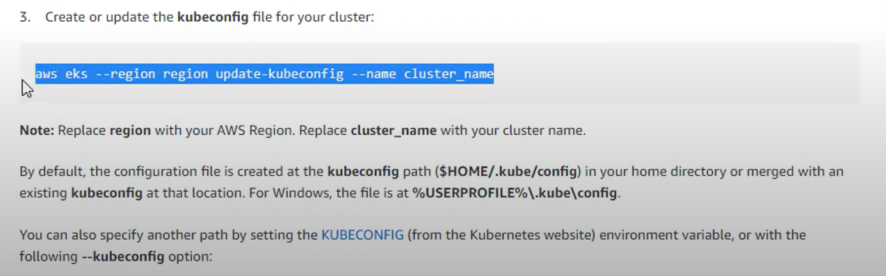 - aws eks --region region update-kubeconfig --name cluster_name