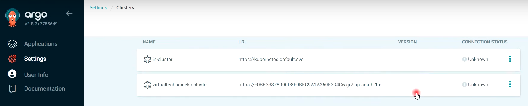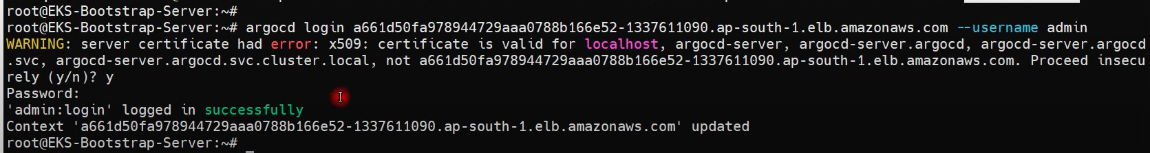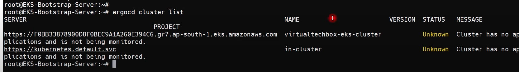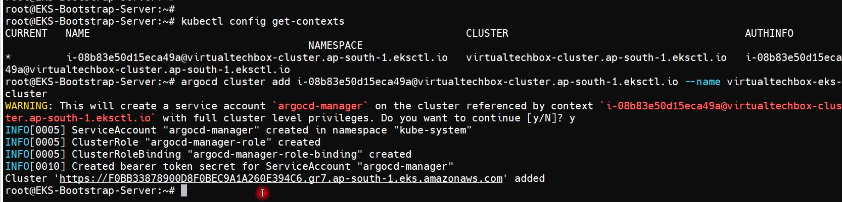 $ argocd cluster add i-08b9d0ff0409f48e7@virtualtechbox-cluster.ap-south-1.eksctl.io --name virtualtechbox-eks-cluster