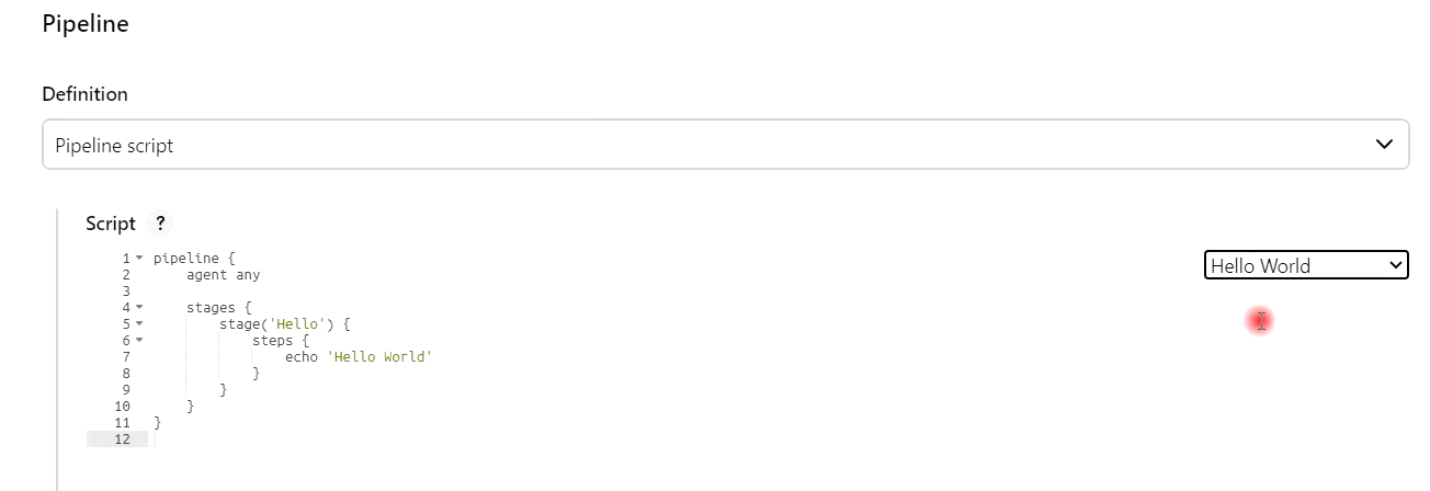 - 파이프라인 생성 --> Test --> ok 클릭 --> Hello world 생성 --> Save