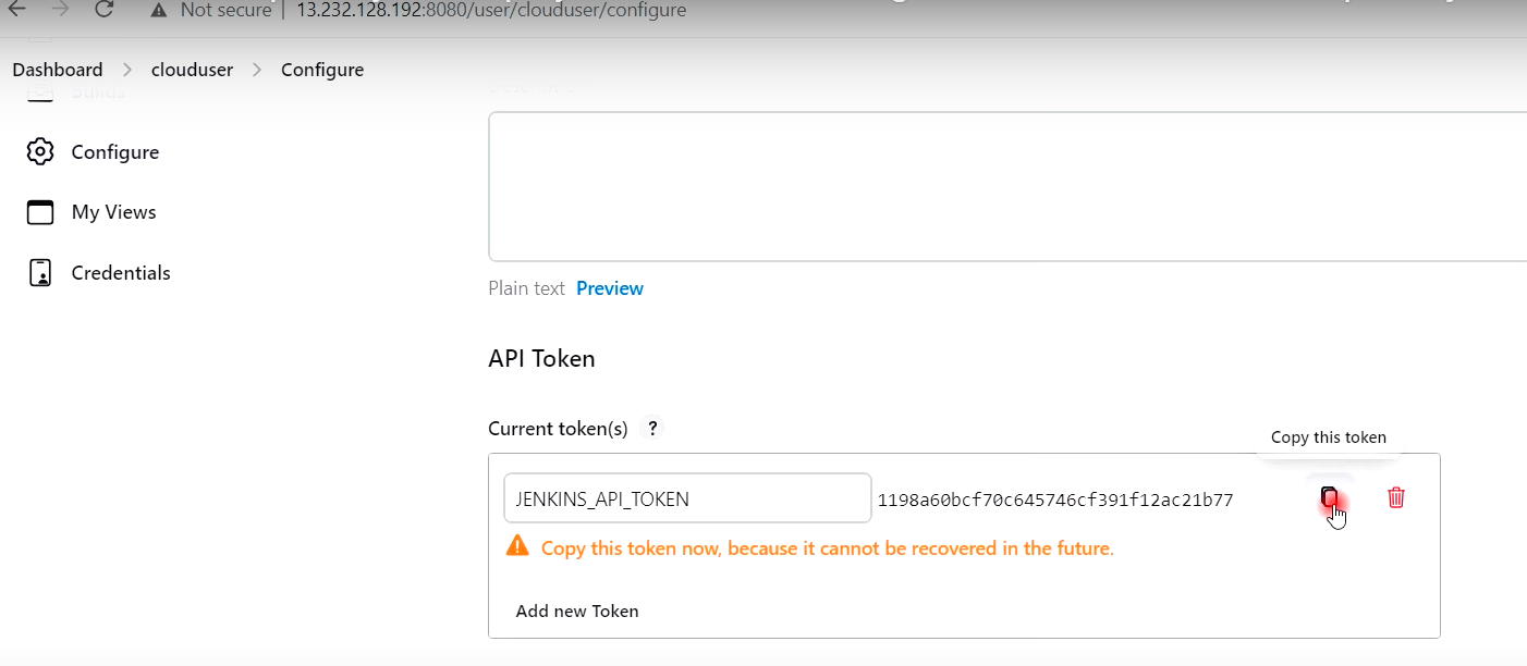 1) 유저 --> Configure --> API 토큰 생성 및 복사 (HTTPS 방식만 허용)