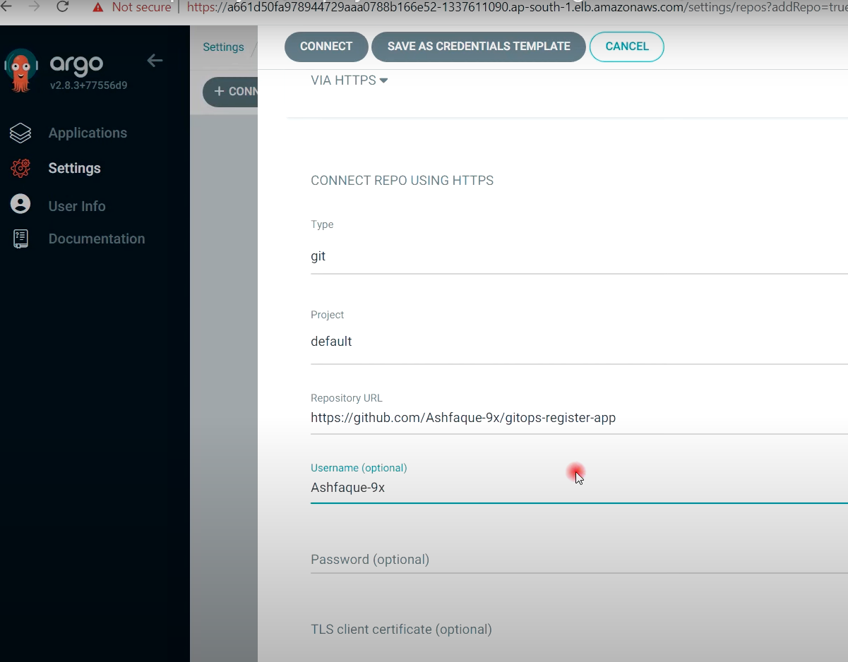 - Argocd --> Settings --> Repositories --> CONNECT REPO --> 깃허브 설정 (비번은 토큰 넣을것!!) --> CONNECT클릭