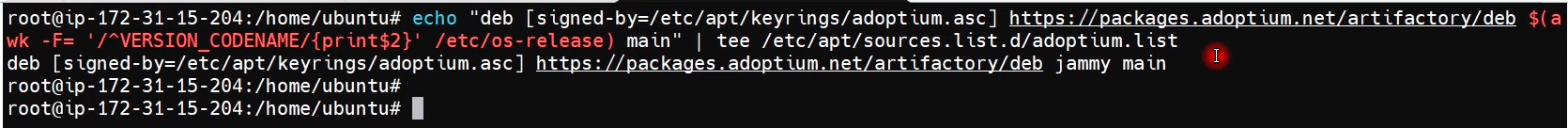 $ echo "deb [signed-by=/etc/apt/keyrings/adoptium.asc] https://packages.adoptium.net/artifactory/deb $(awk -F= '/^VERSION_CODENAME/{print$2}' /etc/os-release) main" | tee /etc/apt/sources.list.d/adoptium.list