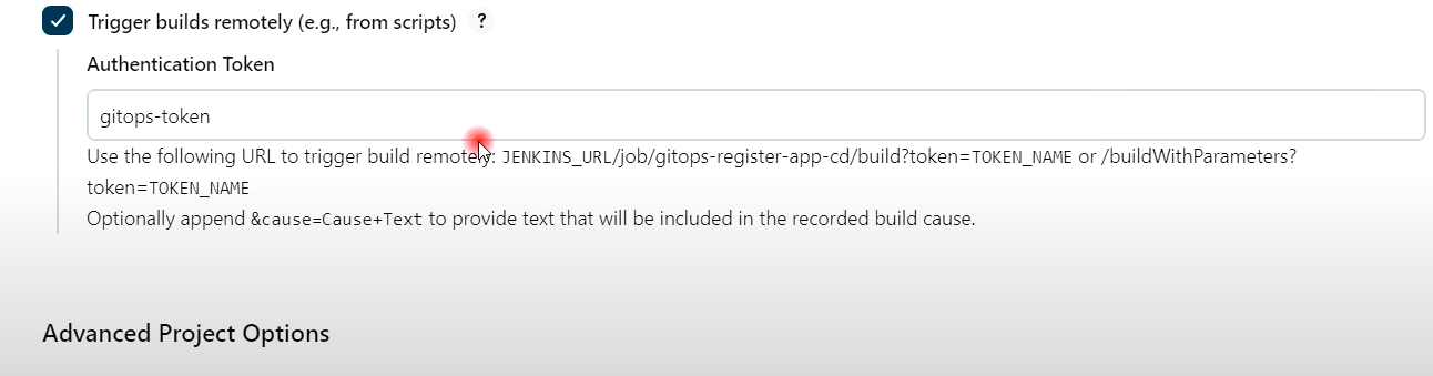 sh "curl -v -k --user clouduser:${JENKINS_API_TOKEN} -X POST -H 'cache-control: no-cache' -H 'content-type: application/x-www-form-urlencoded' --data 'IMAGE_TAG=${IMAGE_TAG}' 'http://젠킨스 내부IP주소:8080/job/gitops-register-app-cd/buildWithParameters?token=gitops-token'"