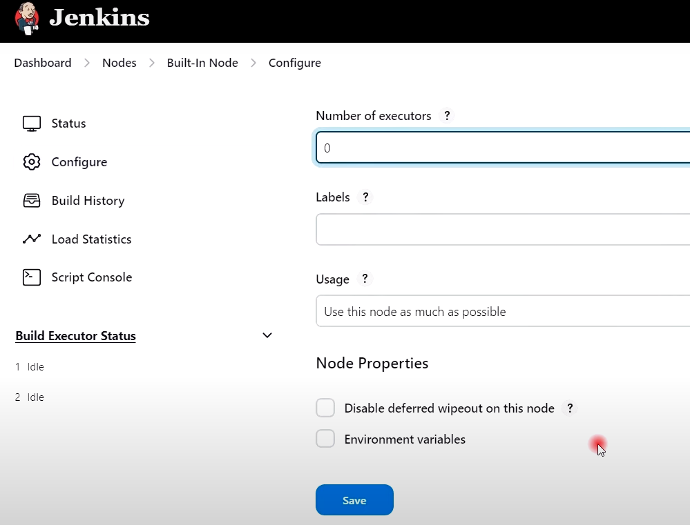 - 젠킨스 관리 --> 노드 --> Built-In Node 클릭 --> Configure 클릭 --> Number of executors '0' 선택 --> SAVE