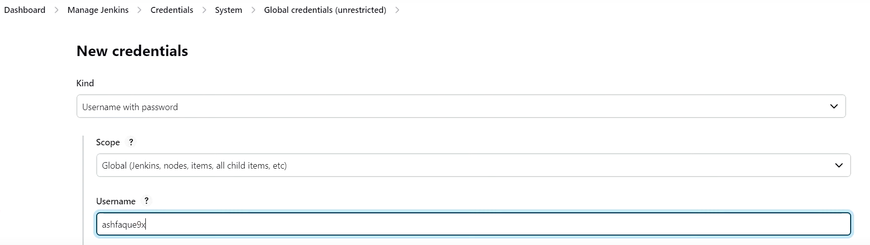 - 젠킨스 관리 --> Credentials --> Add Credentials (Username 과 Password 동일해야 함)