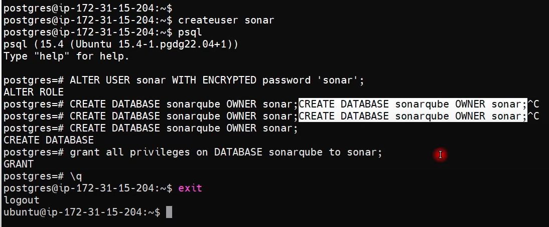 $ CREATE DATABASE sonarqube OWNER sonar;