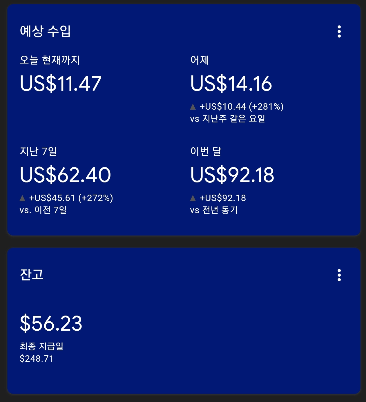 | [11/25][역행자 동기부여] 블로그 성장기 애드핏&애드센스 수익 !! (40) | 2023.11.25 |