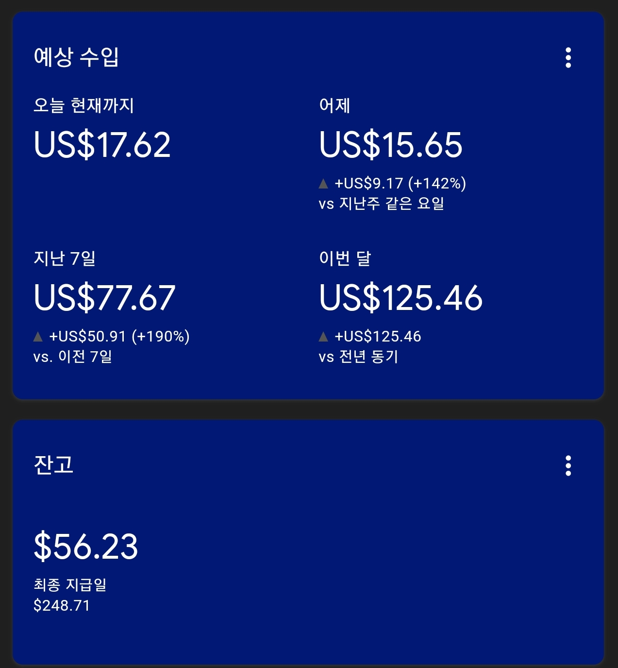 | [11/25][역행자 동기부여] 블로그 성장기 애드핏&애드센스 수익 !! (40) | 2023.11.25 |