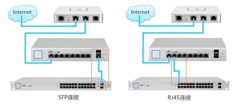 아래 그림은 Gigabit Ethernet 스위치의 RJ45 연결과 SFP 연결의 예입니다. 그 중 왼쪽은 UniFi 스위치의 SFP 연결이고 오른쪽은 UniFi 스위치의 RJ45 연결입니다. SFP 연결에는 2개의 SFP 전기 광 모듈과 카테고리 5 네트워크 케이블을 사용하거나 2개의 SFP 광 모듈과 광섬유 점퍼를 사용해야 합니다. RJ45 연결은 카테고리 5 네트워크 케이블만 사용해야 합니다.