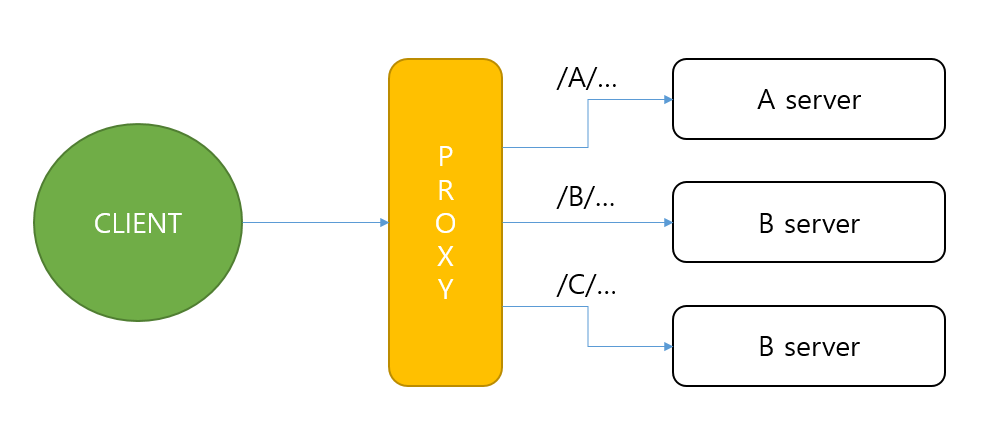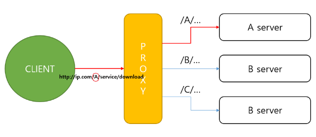 위 그림을 예시로 들면, URL이 http://{ip}/A/service/download 같이 입력하면 A server로 request가 라우팅되고, http://{ip}/B/service/download 같이 입력하면 B server로 request가 라우팅되는 형식이다.