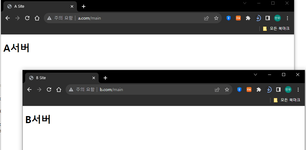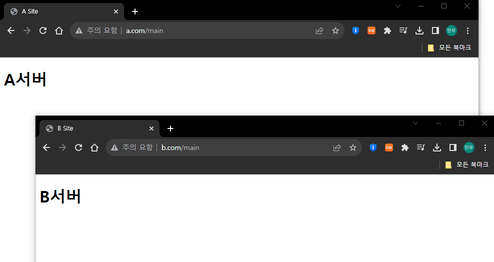 위의 설정까지 완료된 후 http://a.com/main, http://b.com/main으로 들어가보자.