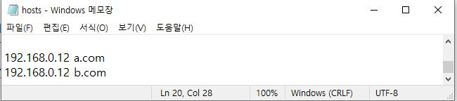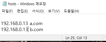 192.168.0.12 b.com - hosts 파일은 보안 관련 파일이기에 사용중인 보안 프로그램에 따라 수정이 불가할 수 있으니, 반드시 보안 프로그램을 해제하고 진행할 것. (알약의 경우 설정 > 검사 > 실시간 감시 > 호스트 파일 보호 > off)