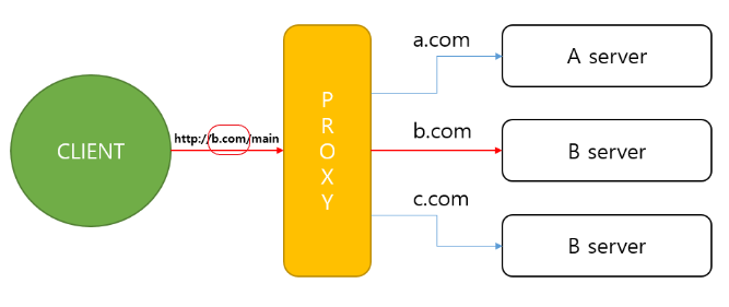 예를 들어 CLIENT가 http://b.com/main URL을 입력했을 때 리버스 프록시는 b.com 도메인에 대한 서버인 B server로 라우팅을 수행한다.