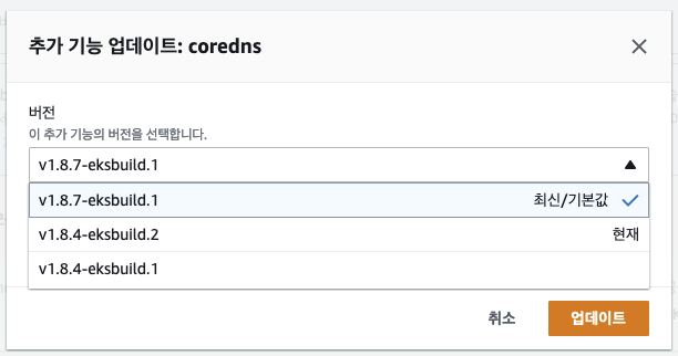 ㅇ EKS 1.22와 맞는 v1.8.7-eksbuild.1로 업데이트를 진행하였다.