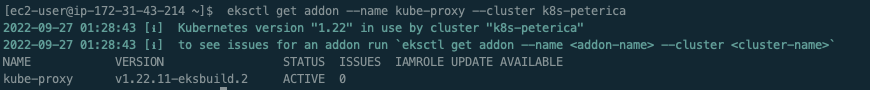 2022-09-27 01:19:33 [ℹ] to see issues for an addon run `eksctl get addon --name <addon-name> --cluster <cluster-name>`