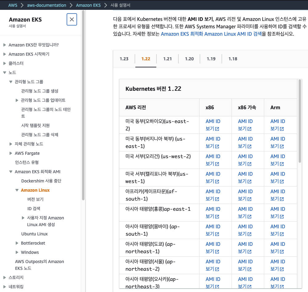 ㅇ 이 곳에서 다음과 같은 표의 링크를 통해 Kubernetes 버전에 맞는 AMI ID를 찾아 볼 수 있다.